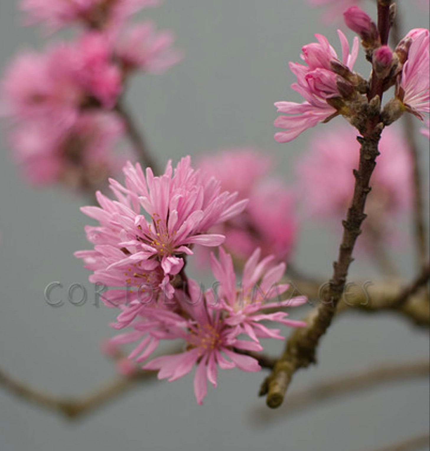 A tiny bloom from one of the bonsai trees. The color contrasting with the green pine needles. The tiny buds. The slight wilting of the flower petals.